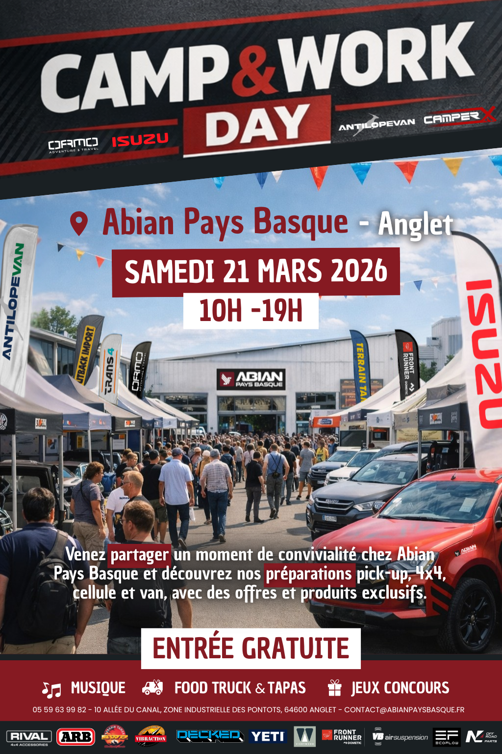 Le samedi 21 mars, de 10h à 19h, Abian Pays Basque vous accueille pour la 1ʳᵉ édition du Camp & Work Day. Une journée placée sous le signe du pick-up, du 4×4, des solutions professionnelles et de l’équipement off-road, pensée pour se rencontrer, échanger et découvrir.