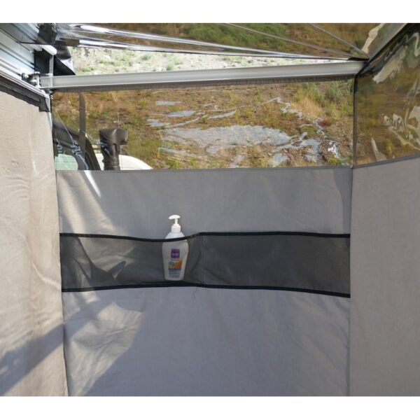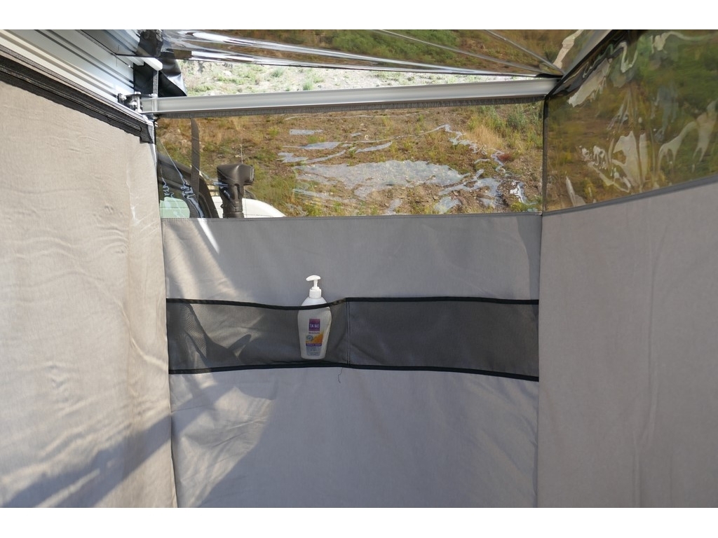 L’abri-douche Falcon se distingue également par son toit en plastique souple transparent et ses fenêtres teintées à hauteur des yeux, garantissant l’intimité tout en laissant entrer la lumière naturellement. Cela crée une ambiance agréable et vous permet de rester connecté à votre environnement extérieur. À l’intérieur, des poches bien pensées sont disponibles pour organiser vos accessoires de bain, les rendant facilement accessibles. Une cabine de douche à la fois élégante et fiable, offrant un parfait mélange de robustesse, de fonctionnalité et d’esthétisme. Un système idéal pour améliorer votre expérience de vie en ajoutant une touche de confort très appréciable à vos aventures en mode Vanlife.