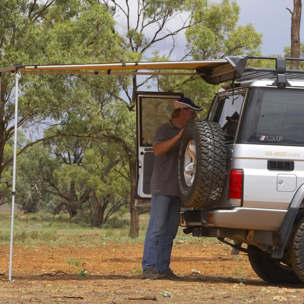 Simple set-up and operation. Designed for use on the back of roof racks or Side of smaller SUV’s and stores neatly in a sturdy soft bag.