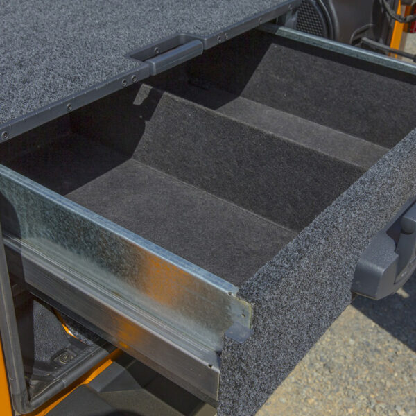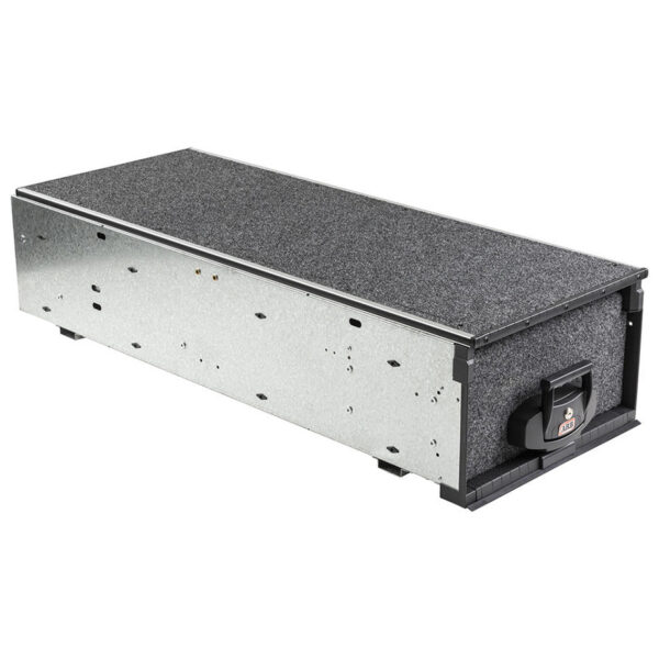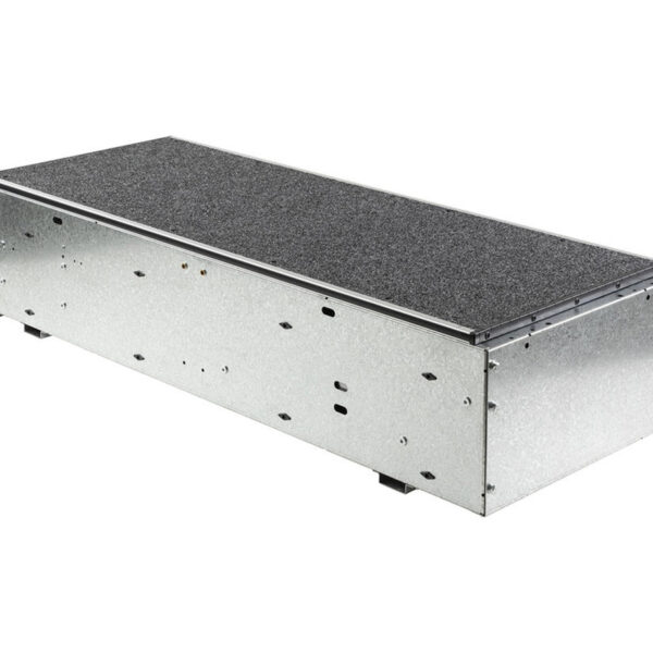 Ce tiroir résistant repose sur des glissières à roulements sphériques pour une ouverture fluide, même en charge. Il offre une extension de 72 % et une capacité de charge de 125 kg. Le plateau supérieur fixe permet d’y poser d’autres modules ou équipements. Grâce à sa structure en acier renforcé et son plancher en contreplaqué marin étanche, il est conçu pour durer, même en conditions extrêmes. Le revêtement moquette anti-UV, le système de verrouillage à clé, la fermeture par loquet à claquement et le mécanisme anti-retour à extension maximale garantissent sécurité, confort d’utilisation et adaptabilité à toutes les situations. Ce modèle peut s’installer à l’arrière du véhicule, avec ou sans hardtop ou revêtement de benne.