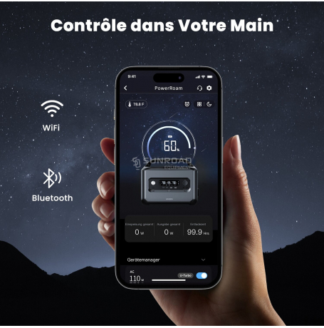 Surveillez et contrôlez votre batterie lithium PowerRoam grâce à l’application UGREEN, disponible en Bluetooth ou Wi-Fi. Cette application vous permet d’activer des fonctions comme le mode silencieux, l’économie d’énergie, la sécurité enfant, et bien plus encore. L’écran LCD de 12 cm affiche en temps réel l’état de la batterie ainsi que les entrées et sorties d’énergie.