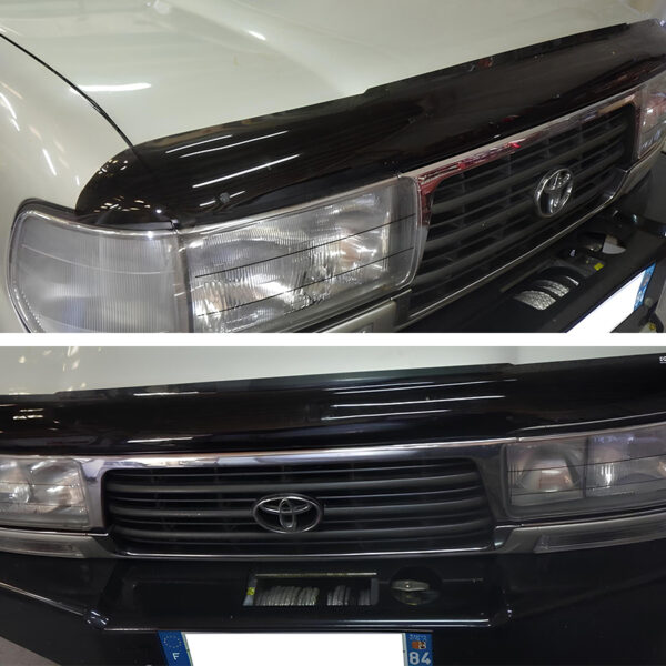 Le déflecteur est fabriqué en acrylique moulé teinté dans la masse, avec une finition fumée discrète. Ce matériau est rigide, résistant aux UV, et adapté aux variations de température. Sa forme est spécifique à chaque modèle de véhicule pour garantir un ajustement précis sans interférer avec l’ouverture du capot.
