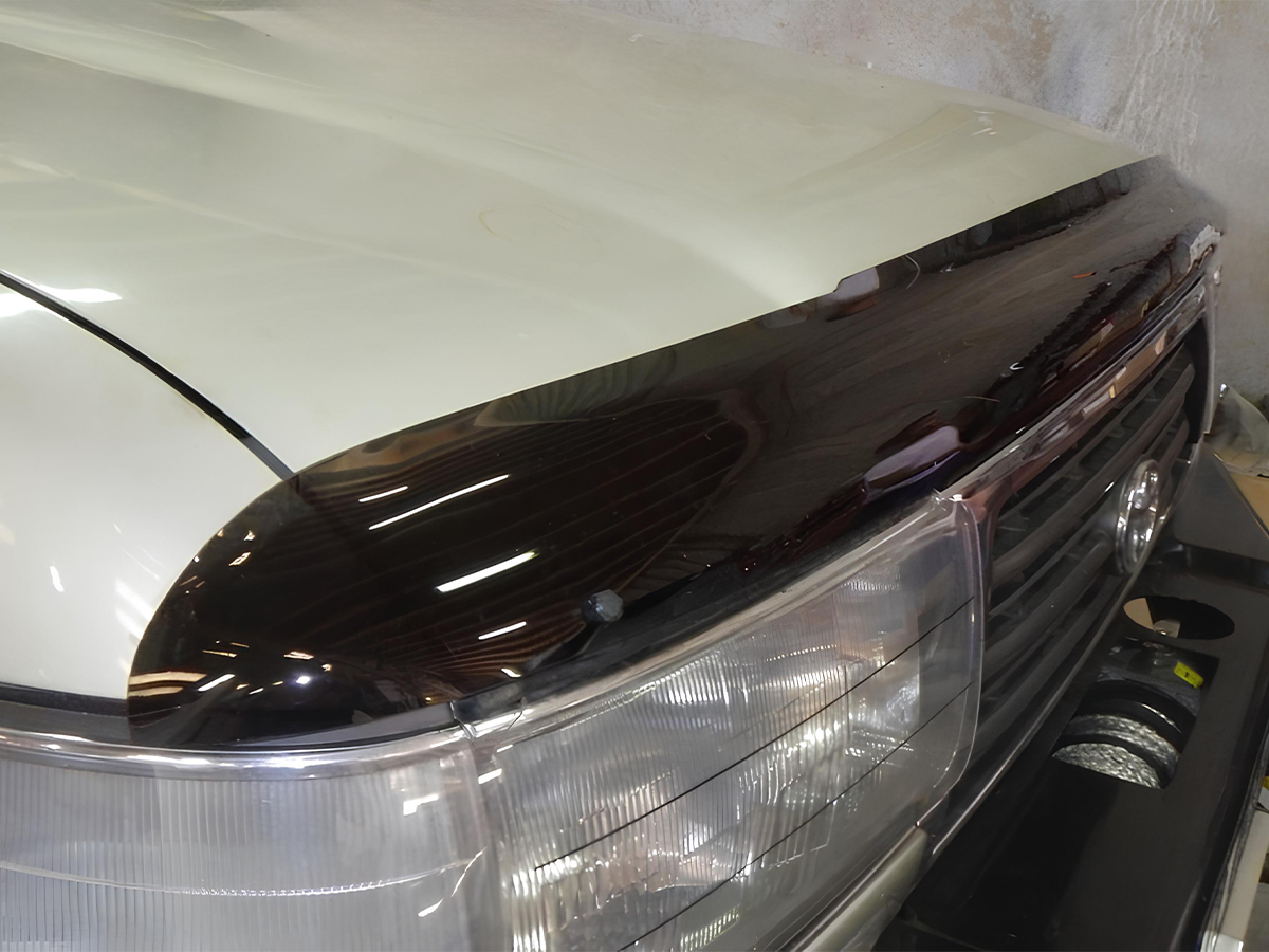 Le déflecteur est fabriqué en acrylique moulé teinté dans la masse, avec une finition fumée discrète. Ce matériau est rigide, résistant aux UV, et adapté aux variations de température. Sa forme est spécifique à chaque modèle de véhicule pour garantir un ajustement précis sans interférer avec l’ouverture du capot.