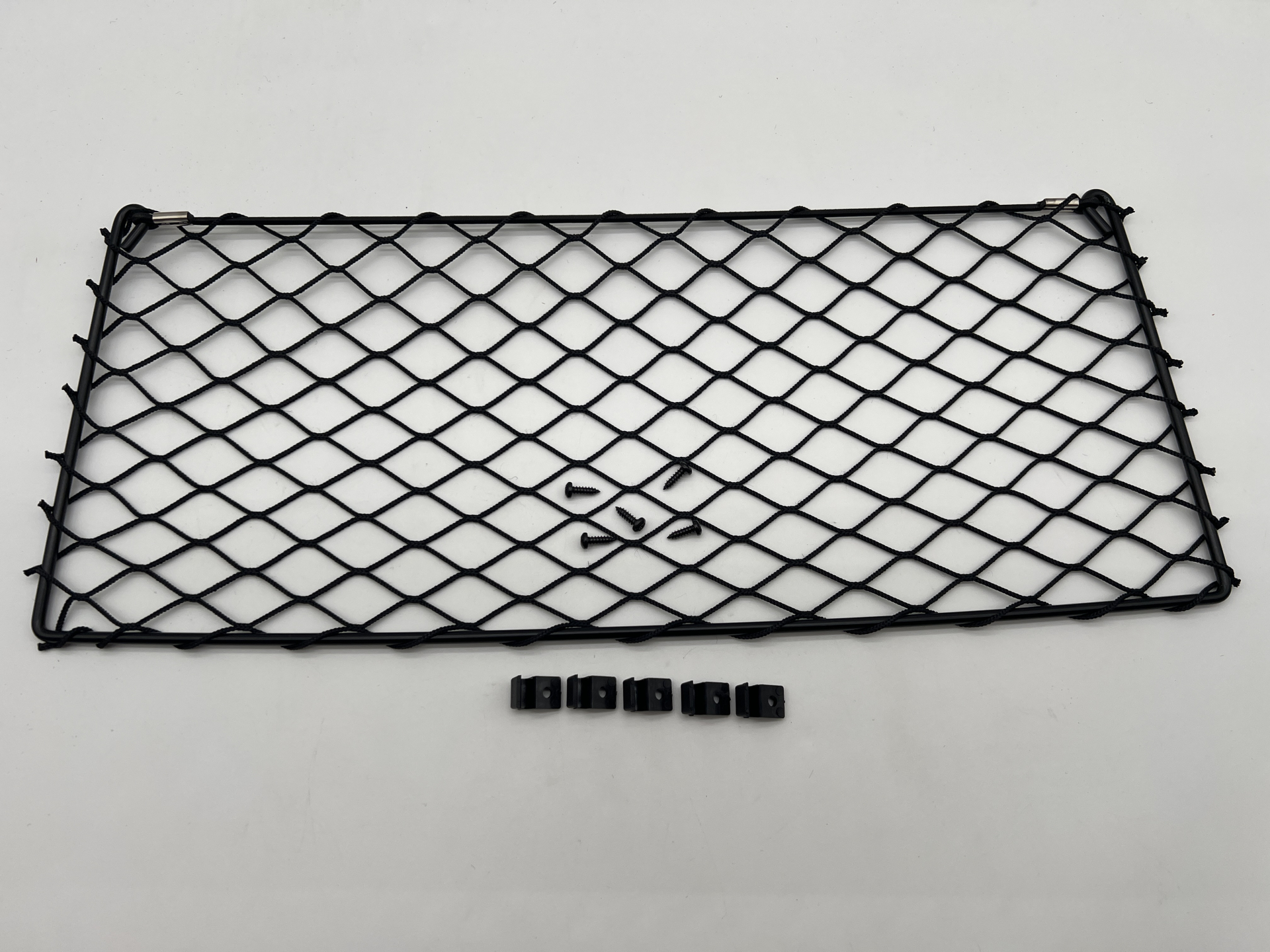 Filet de rangement avec cadre acier noir 370x200mm – avec cavaliers de fixation et vis