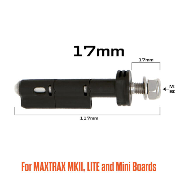 Les fixations rapides 17mm de Maxtrax sont spécialement conçues pour monter solidement 2 ou 4 plaques Maxtrax MKII sur votre galerie de toit, barres transversales ou supports de montage. Fabriquées en nylon renforcé à la fibre de verre et acier inoxydable, ces fixations offrent une résistance optimale aux vibrations, aux intempéries et à la corrosion. Grâce à leur filetage M10 de 17mm, elles s’adaptent parfaitement aux configurations nécessitant des axes courts, notamment les Flat Rack Mounts.