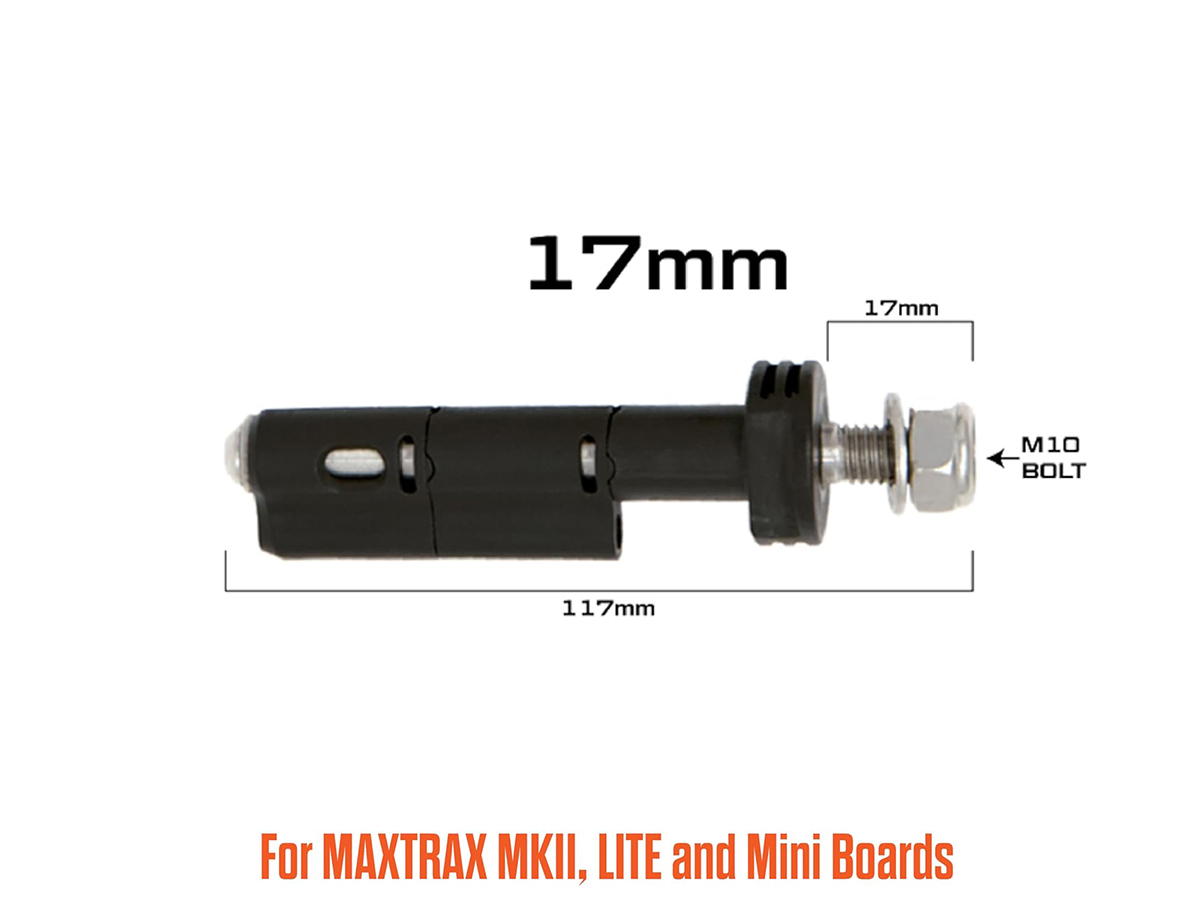 Les fixations rapides 17mm de Maxtrax sont spécialement conçues pour monter solidement 2 ou 4 plaques Maxtrax MKII sur votre galerie de toit, barres transversales ou supports de montage. Fabriquées en nylon renforcé à la fibre de verre et acier inoxydable, ces fixations offrent une résistance optimale aux vibrations, aux intempéries et à la corrosion. Grâce à leur filetage M10 de 17mm, elles s’adaptent parfaitement aux configurations nécessitant des axes courts, notamment les Flat Rack Mounts.