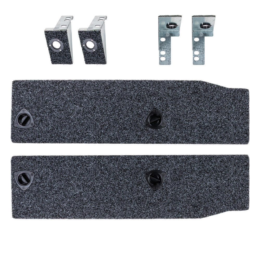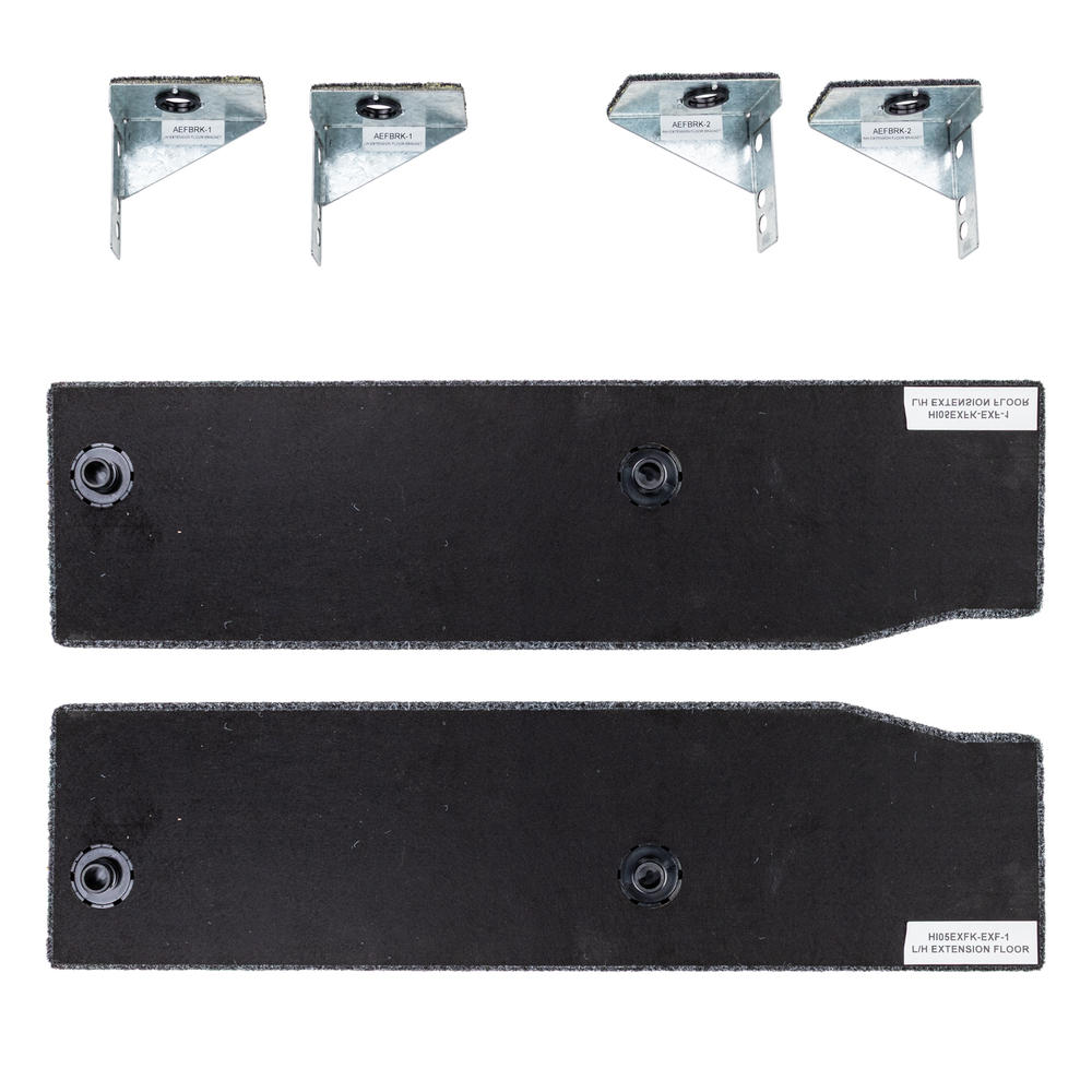 Each side floor kit contains both left and right hand side floors. Stainless steel locking tabs locate and retain one end of the removable floor section, while the other end is attached with a simple to use push to close latch. A single lever disengages the latch for floor removal. The combination of stainless steel tabs and a simple straight forward latch, results in a very easy to use and secure storage area.