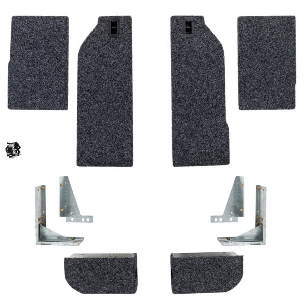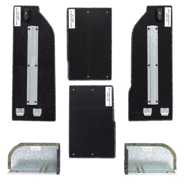 Each side floor kit contains both left and right hand side floors. Stainless steel locking tabs locate and retain one end of the removable floor section, while the other end is attached with a simple to use push to close latch. A single lever disengages the latch for floor removal. The combination of stainless steel tabs and a simple straight forward latch, results in a very easy to use and secure storage area.