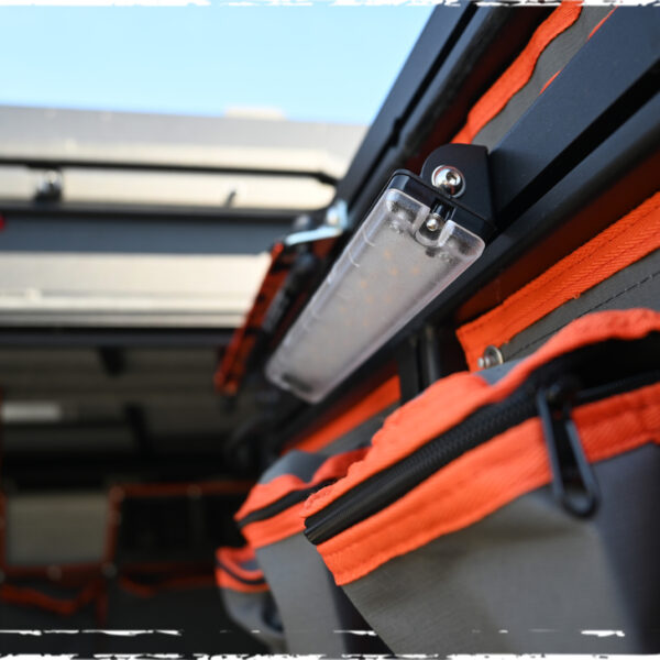 Un autre point fort à l’intérieur est la répartition intelligente avec une lumière rouge-blanc alternée, qui offrent une bonne visibilité et l’ambiance idéale à tout moment de la journée, ainsi que le système de rangement fixé dans la partie supérieure de la tente.
