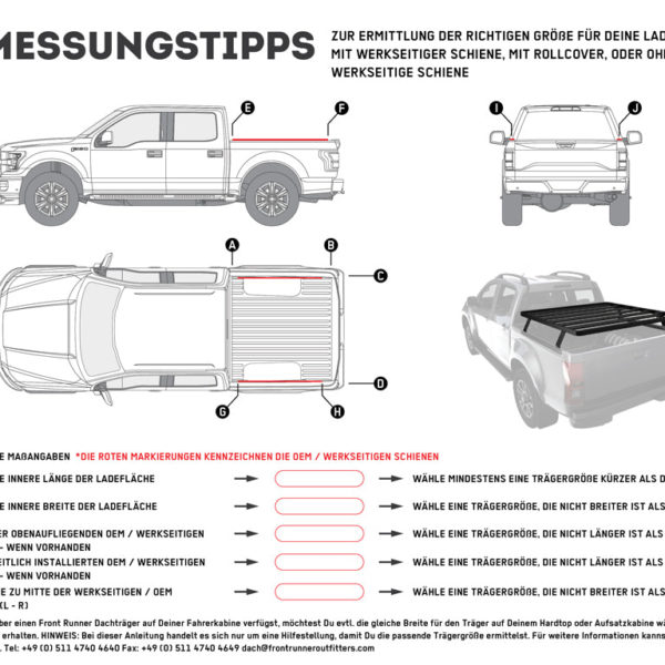 KRLB001T – Kit de galerie pour une benne de Pick-Up / 1255mm (largeur) x 1358mm(longueur) – Slimline II de Front Runner Contient : 1 x FITT002 – Instructions de montage pour un véhicule spécifique 2 x LASS026 – Pieds Universels pour une benne de Pick-Up 188mm (Paire) 1 x RRSTD07 – Plateau Slimline II – 1255mm (largeur) x 1358mm (longueur) x 50mm (hauteur) 1 x TRBU001 – Rails pour une benne de Pick-Up 1000mm (Paire) Matériaux utilisés : Aluminium T6 en époxy noir Acier à haute résistance Poids approximatif d’installation : 24kg La rainure en T sur le haut et sur le bas du plateau de la barre transversale convient pour un boulon de 8mm (standard). Pour déterminer la hauteur du pied de fixation de la galerie pour que la galerie ne touche pas le pavillon du véhicule, bien vérifier le bombé du toit avec une règle afin d’effectuer la bonne hauteur de la patte de fixation. Si votre gallérie Slimline II a besoin de pieds, ajoutez la hauteur du plateau Slimline II (50mm) à la hauteur des pieds pour déterminer la hauteur de galerie à partir de votre gouttière. Si votre galerie Slimline II a besoin de pieds de rails, ajoutez la hauteur du plateau Slimline II (50mm) à la hauteur des pieds de rails pour déterminer la hauteur de la galerie à partir du point le plus haut du toit de votre véhicule. Dimensions de livraison : Largeur : 450mm Longueur : 1615mm Hauteur : 140mm Poids de la livraison : 28,0kg