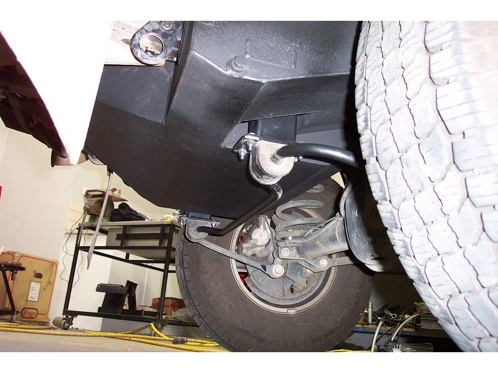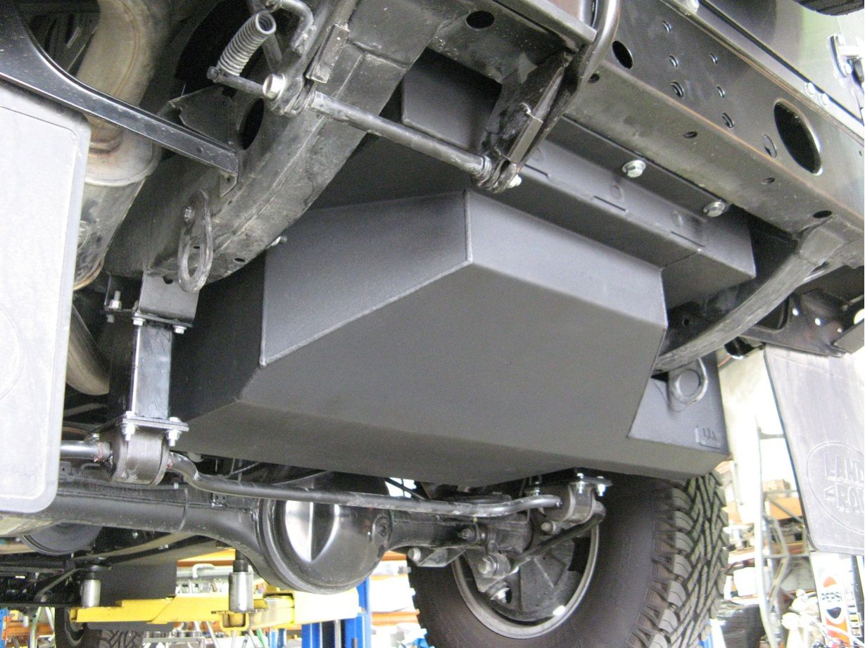 Emplacement optimisé derrière l’essieu arrière, sans interférence avec la roue de secours ou le bras Panhard