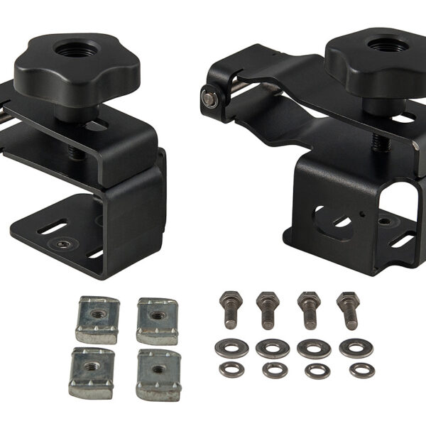 Le système comprend deux supports en acier avec revêtement anticorrosion, compatibles avec les rails latéraux des plateformes Pioneer. Le cric se fixe à l’aide d’une tige filetée avec molette de serrage rapide, pour une installation et un retrait sans outil. Ce montage horizontal permet d’optimiser l’espace sur la galerie tout en assurant une bonne accessibilité.