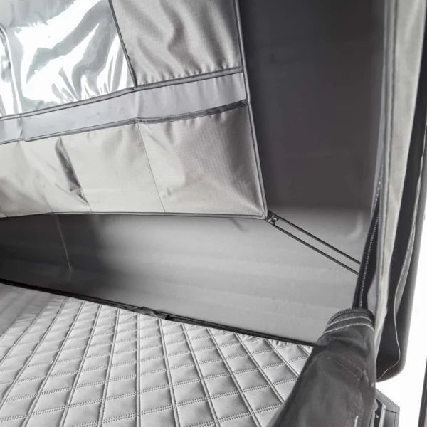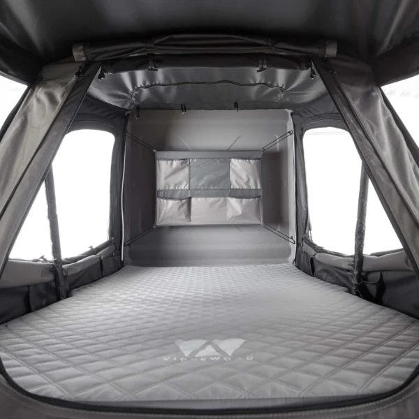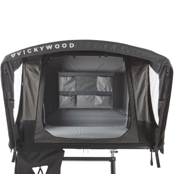 La VICKYWOOD TEAK 135 grise est une tente de toit hybride ultra-légère, dotée d’une coque rigide en aluminium recyclable. Elle s’adresse aux aventuriers exigeants qui veulent combiner légèreté, rapidité d’installation, confort haut de gamme et capacité de transport supplémentaire.