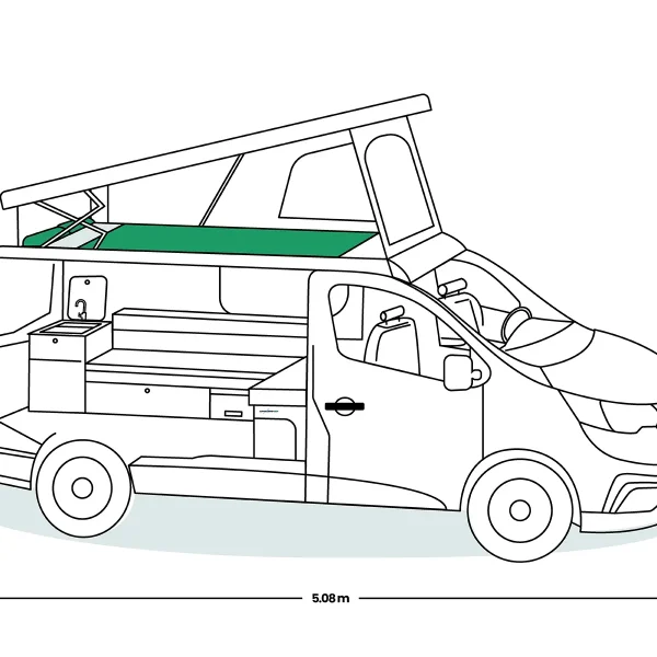 Le Flex Confort PLUS a une hauteur de moins de 2 mètres, ce qui représente un avantage considérable pour un van aménagé tout équipé. Cette dimension permet d’accéder à la majorité des parkings souterrains et de bénéficier d’un tarif préférentiel en classe 1 aux péages autoroutiers. Une fois le toit relevable déployé, la hauteur intérieure devient plus généreuse, offrant une meilleure aisance pour les déplacements à l’intérieur du van.
